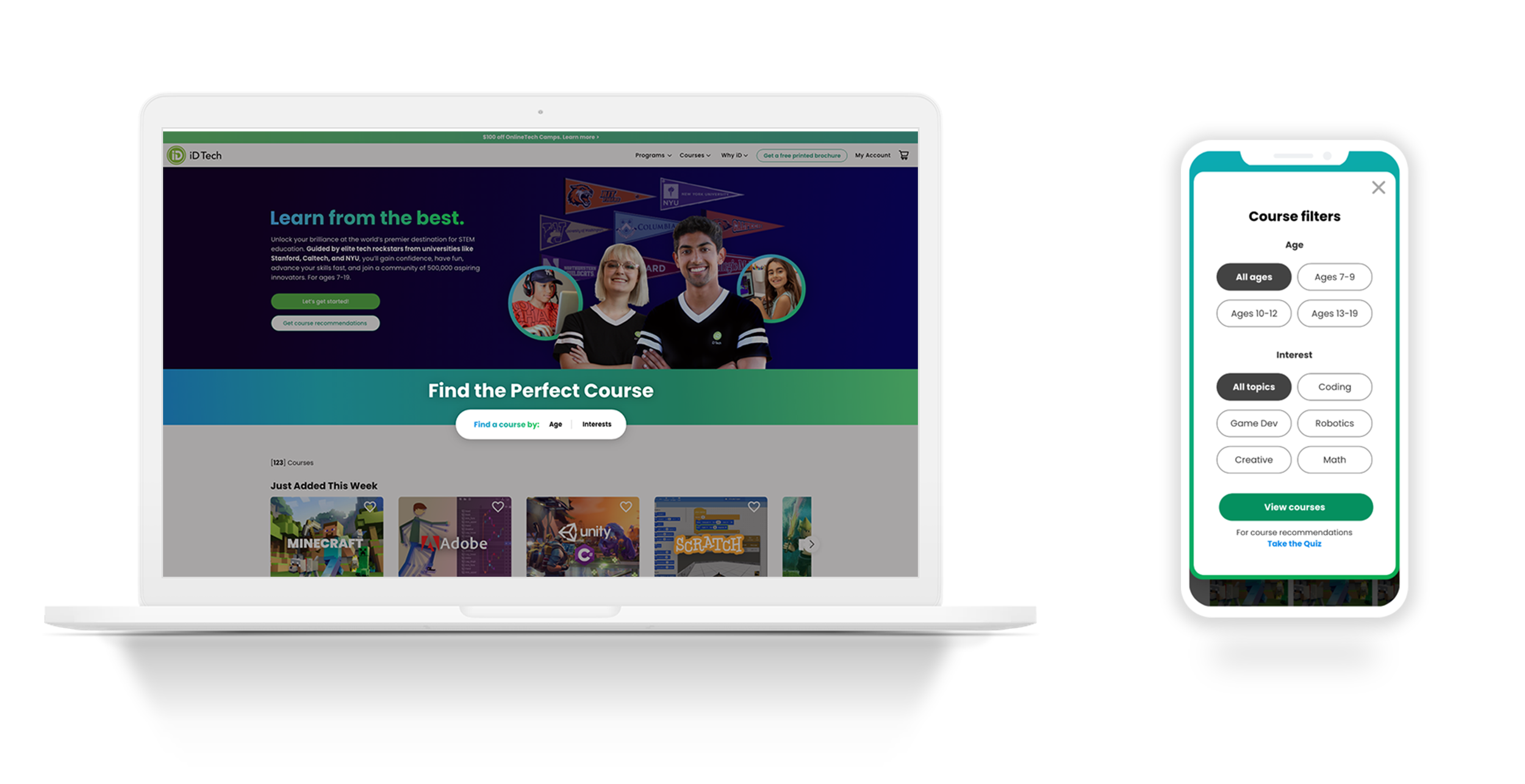 During user testing, we learned that users were confused when presented a myriad of courses and experienced a bit of choice paralysis. For the most part, parents do know their child’s age and interests so by positioning a filter with these two values was a huge benefit to the experience by surfacing the most relevant courses.