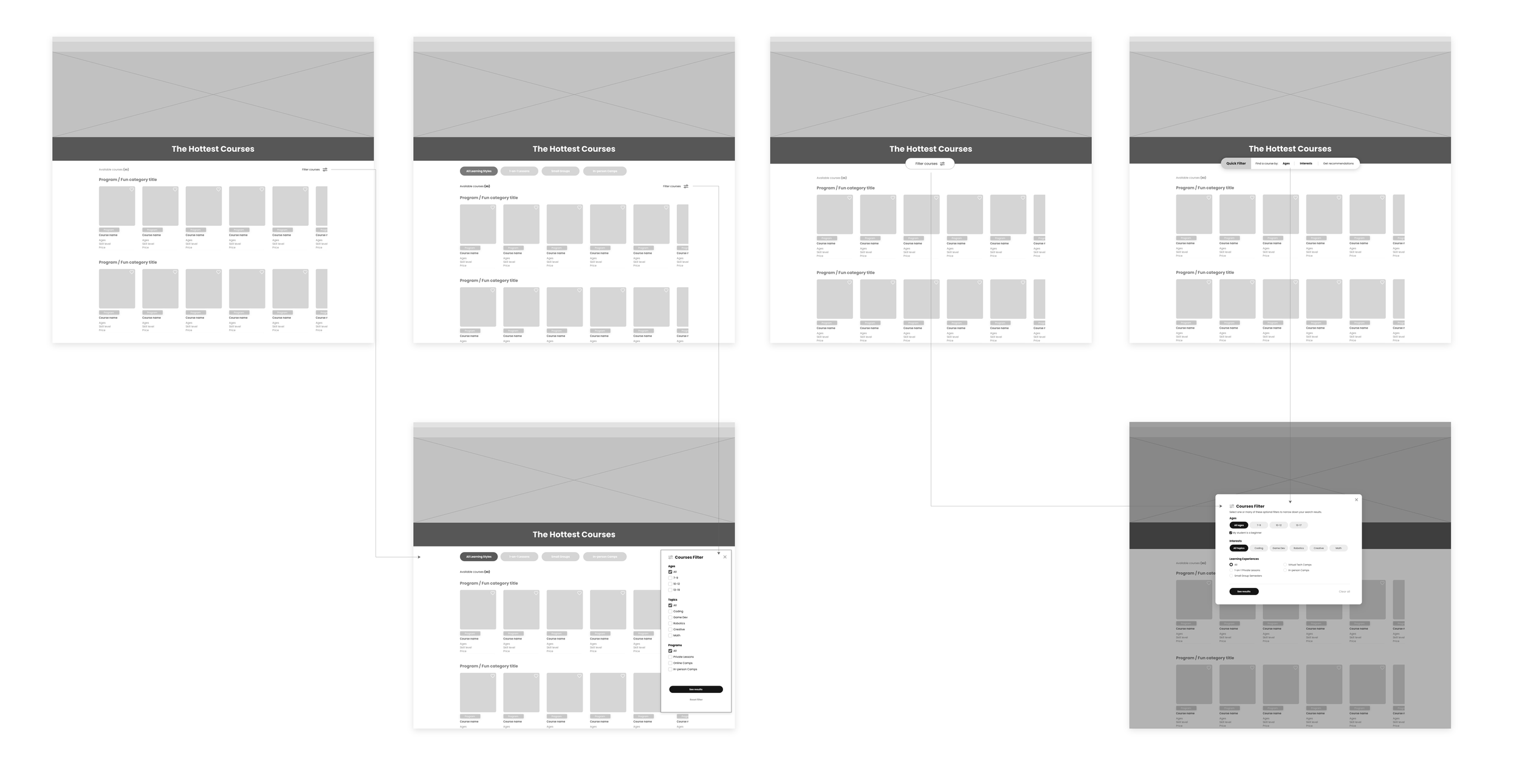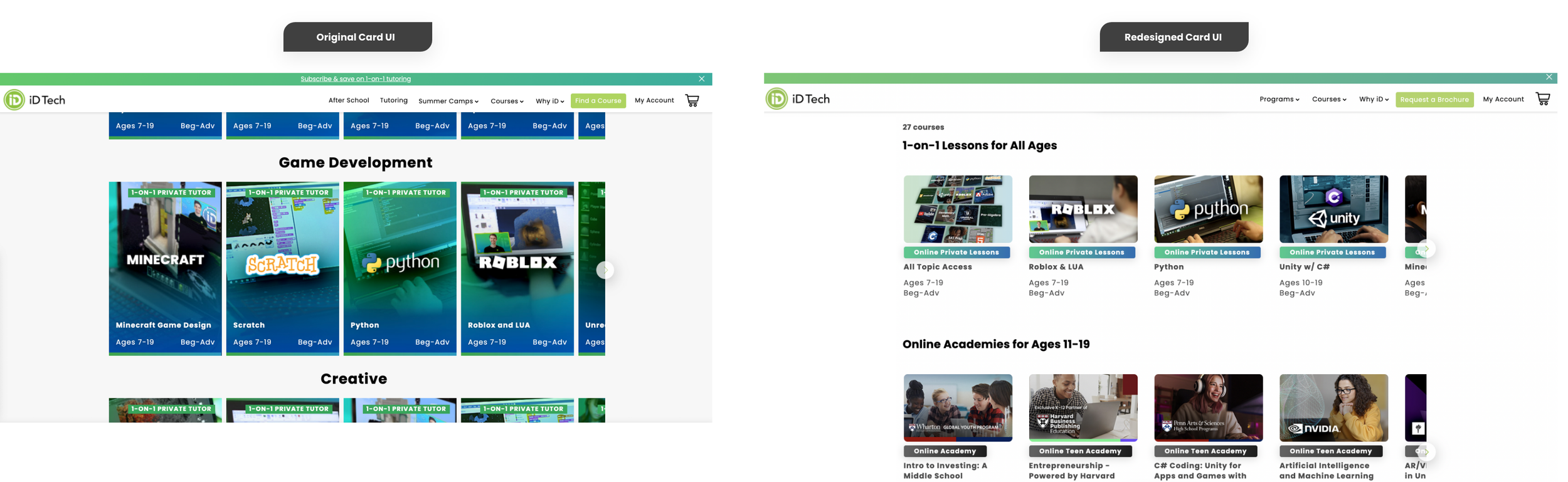 The original design had an endless grid of courses which the user had to scroll the page vertically, as well as scroll/swipe each row horizontally to find the perfect course for their child. The problem was that most users, (Especially with new users) didn’t really understand the product offerings and the benefits for their child. These insights were revealed during user testing.