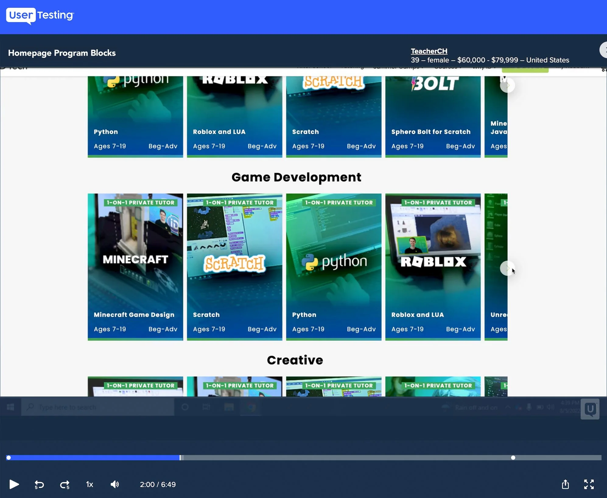 UserTesting.com is great resource to gain user insights. Besides seeing how users interact with your product, this platform is also a good resource to ask the testers open-ended questions during the test. I tested the current version of the programs block (live site).
