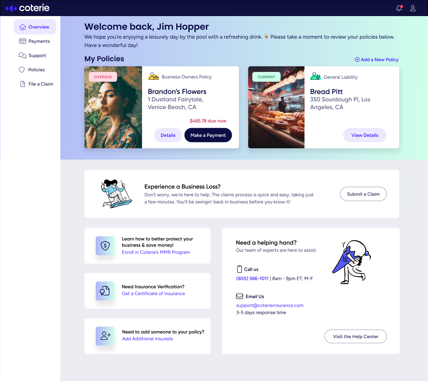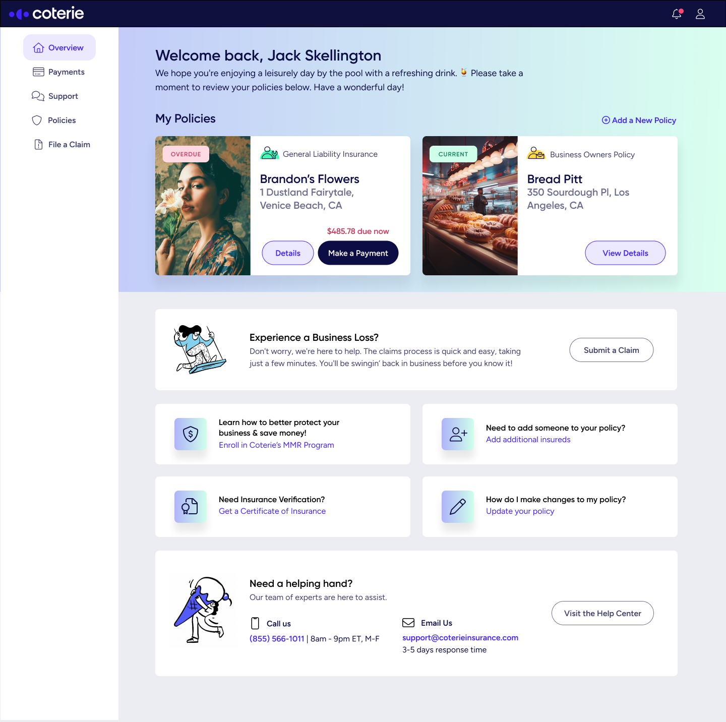 Policyholder dashboard homepage concept