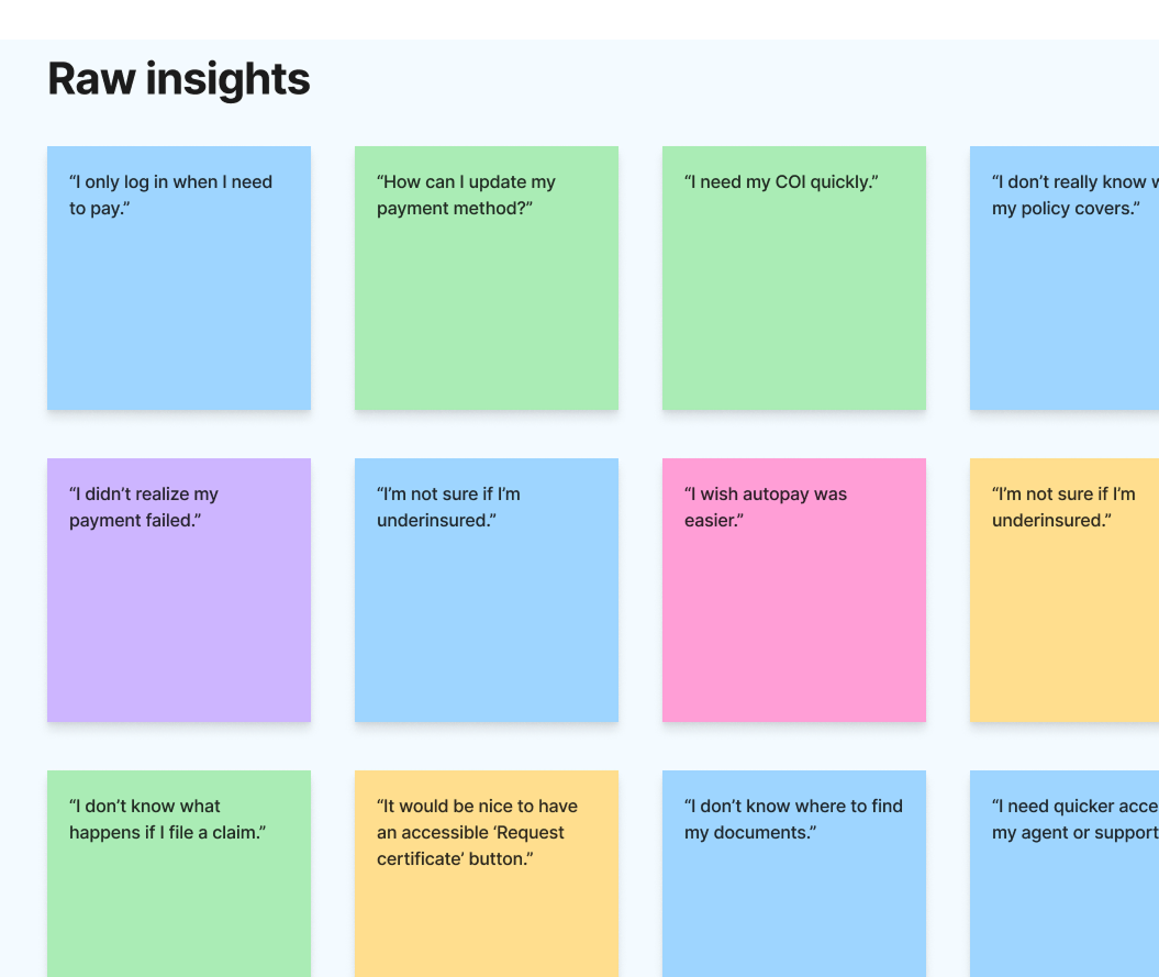 Based on user research, I identified several high-priority self-service features requested by policyholders. Here are a few product improvements gathered from research: COI generator, update payment method, and policy endorsement. Considering both user needs and available engineering resources, we (PM and myself) prioritized launching the self-service payment feature first.